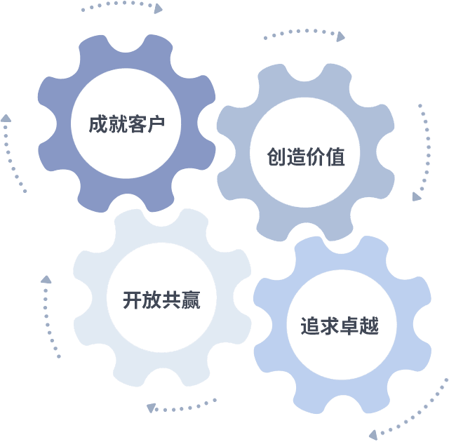 成就客户是一切决策的出发点,,,,创造价值是衡量所有工作的标准,,追求卓越是我们做事做人的态度,,,开放共赢是我们的格局也是最终的结果。。价值观的齿轮环环相扣,,推动着组织里的每个人不断向前。。
